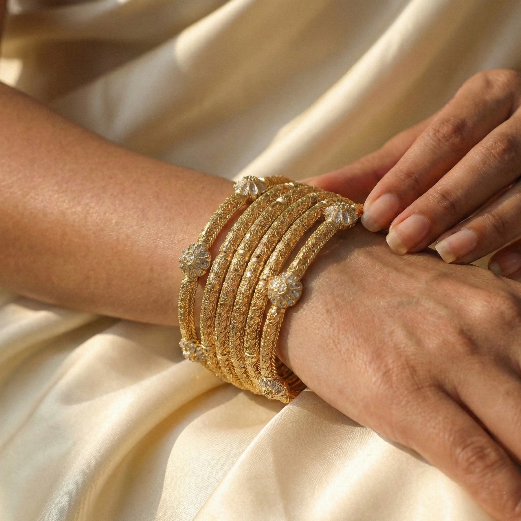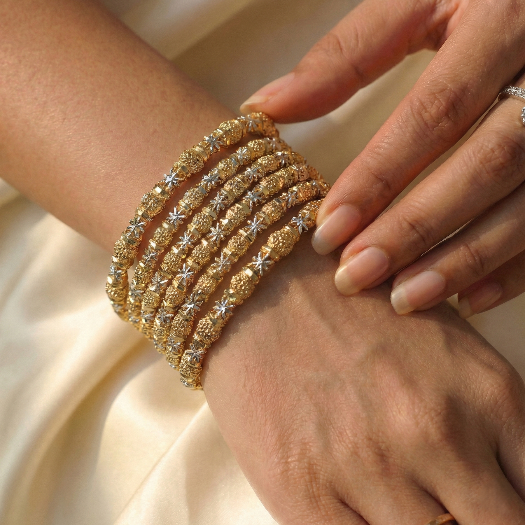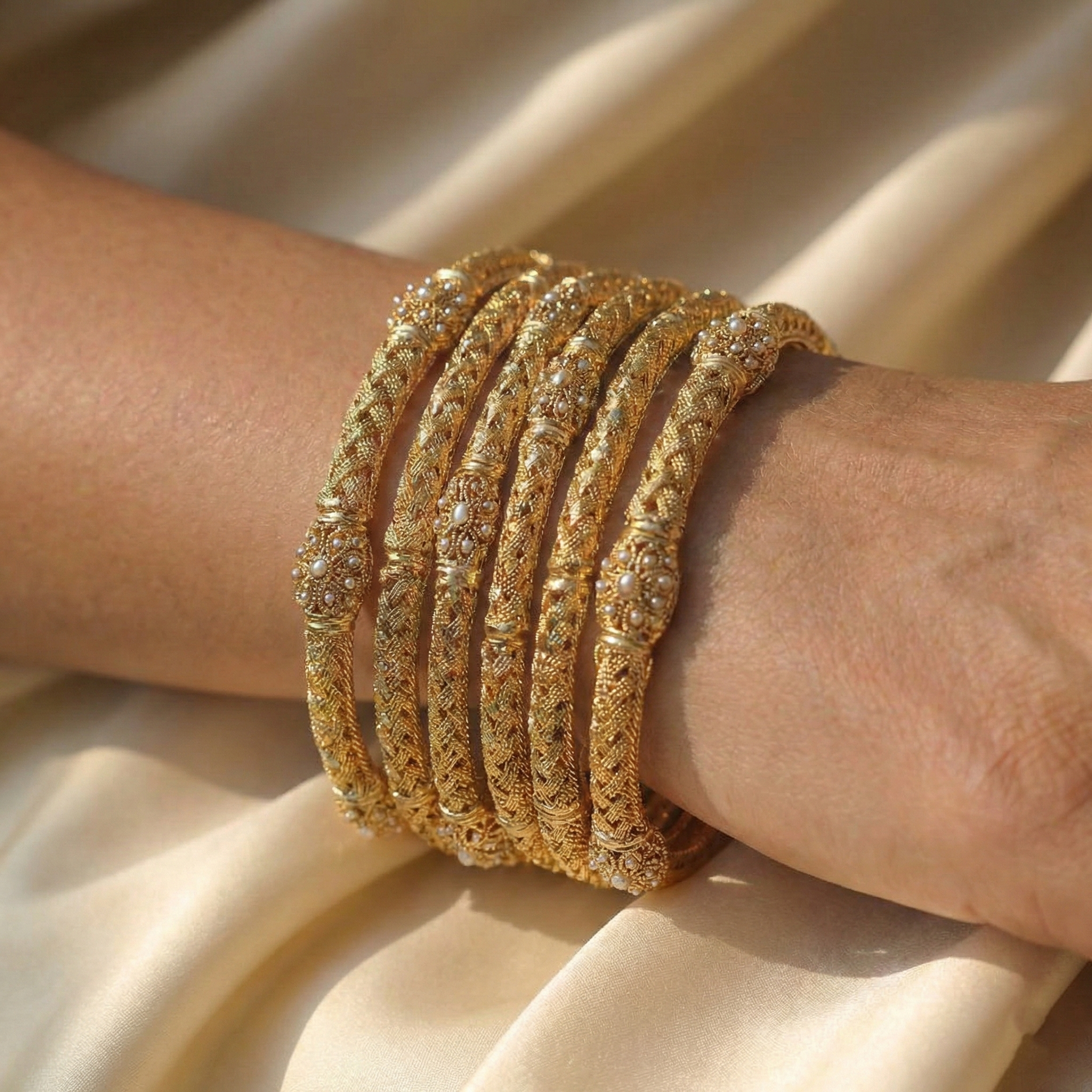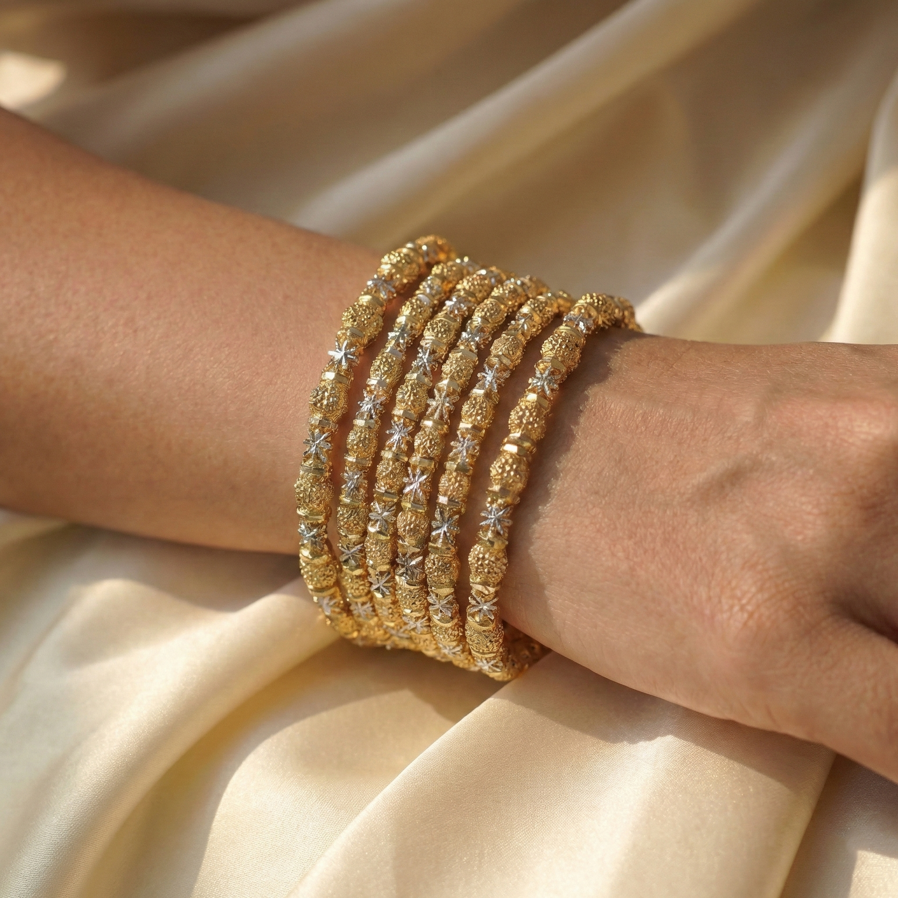 Add a touch of classic glamour to your festive wardrobe with this exquisite gold-finish kara set. Designed for the modern Pakistani woman, these intricately textured artificial bangles feature elegant metallic bead clusters. Perfect for weddings, dholkis, and formal events, this lightweight stack offers a luxurious traditional look to effortlessly complete your favorite outfits.